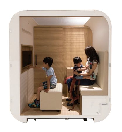 畳1畳ほどのスペースに設置可能な、可動式の完全個室ベビーケアルームです。授乳だけでなく、おむつ交換や離乳食、寝かしつけや着替えなど、幅広い赤ちゃんケアにご利用いただけます。