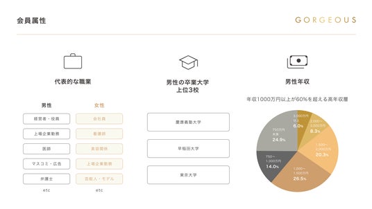 男性会員は早慶・東大卒業が上位3位を占め、経営者・上場企業会社員など年収1,000万円以上が60%超え