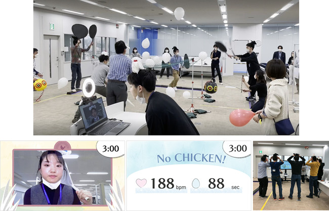 3人Vs 3人のチーム対抗戦です。ニワトリに扮したチームとカラスに扮したチームに分かれ、ニワトリは巣に蓄えた卵を守り、カラスが巣から卵を奪おうとして攻防を繰り広げます。巣を網、卵を風船、鳥の羽をうちわで代用し、カラスチームは風船を網から外に出すようにうちわを振ります。ニワトリチームは、網から外に出た風船を、うちわを使って網に戻します。制限時間終了後に網に残った卵の数が得点に換算され、チームごとにニワトリ役とカラス役を入れ替えて得点を競うスポーツです。スタート直後に網に入っている卵だけでなく、新たに卵を産むことができます。ニワトリチームは1名ずつ順番に産卵エリアに移動し、そこで心拍数を計測します。心拍数が高いと産卵に時間を要し、低いと短時間に卵が産まれる設定で、心拍数が低いと産卵に有利とわかっていても直前まで卵を巣に戻す動きを激しく行うと心拍数が高くなってしまいます。卵を産むことを優先するか、卵を巣に戻すことを優先するかの判断がプレイヤーにゆだねられます。心拍数の計測には、パナソニック コネクトの非接触バイタルセンシング技術が採用されています。カメラで撮影した顔画像から心拍数を推定する技術で、顔画像中の肌色成分の微小変化が心臓の拍動による血流変化に起因していることに着目し、ノイズ除去など独自の信号処理を施した技術です。