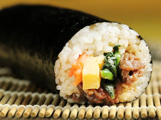 国産黒毛和牛肩ロース100g、厚焼玉子、ほうれん草ナムル、茹で人参を岩塩、ごま油、胡麻で味付けしたご飯、焼海苔で巻き上げている。