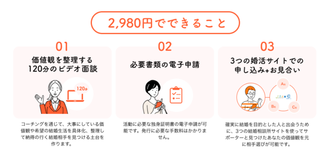 *1:3つの婚活サイトでの申し込み/お見合いは、必要書類のご提出、審査完了後に可能となります。そのため、各種進捗によっては初月期間内にご体験いただけない場合もございます。お見合いに関しては成立を保証するものではありません。