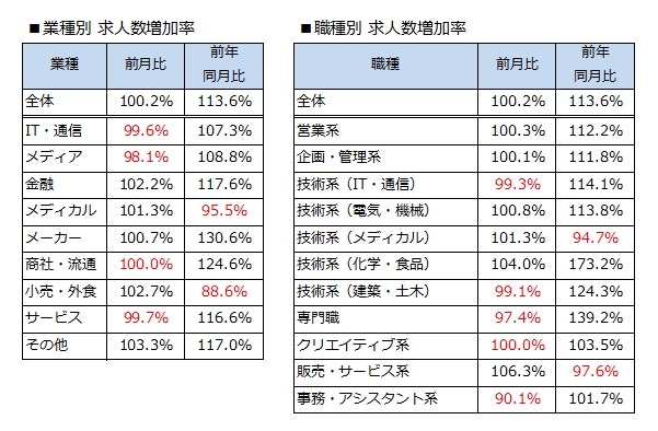 業種別にみると、求人数が増加したのは9業種のうち「金融」「メディカル」「メーカー」「小売・外食」の4業種となりました。特に伸びたのは、「小売・外食」(前月比102.7%)、「金融」(前月比102.2%)でした。職種別で求人数が増加したのは、11職種のうち「営業系」「企画・管理系」「技術系(電気・機械)」「技術系(メディカル)」「技術系(化学・食品)」「販売・サービス系」の6職種となりました。特に伸びたのは、「販売・サービス系」(前月比106.3%)、「技術系(化学・食品)」(前月比104.0%)でした。