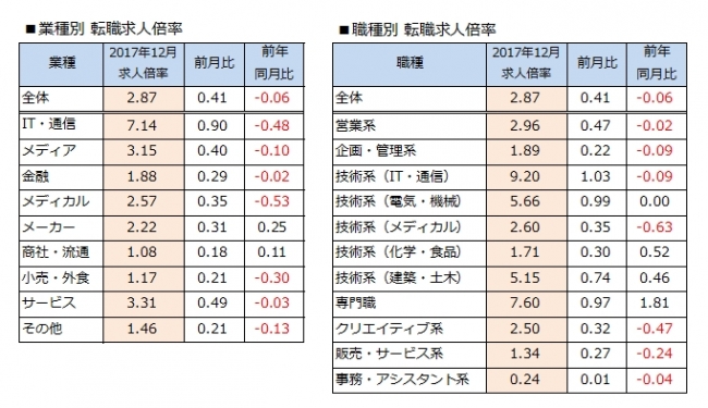 2017年12月の転職求人倍率は、前月比+0.41ポイントの2.87倍となりました。求人数は前月比100.2%、前年同月比113.6%となり、調査開始(2008年1月)以来の最高値を3カ月連続で更新しました。転職希望者数は前月比85.8%、前年同月比116.0%でした。