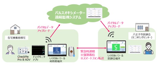その折に、東京都の「令和5年度在宅療養推進強化事業(24時間診療体制推進)」を受託し、今後ますます増加が予想される在宅療養者について、バイタルセンサー等のICTを活用して、遠隔からより効率的に見守りが可能となるよう取り組まれており、タブレット型のみまもりツール「しらせあいコール」と、三栄メディシス株式会社(本社:京都府京都市、代表取締役社長:細見 健司)のCheckMePro B ADVと東京都の新型コロナ対応でも採用されていた「パルスオキシメーター遠隔監視システム」を連携する形でご採用いただいております。