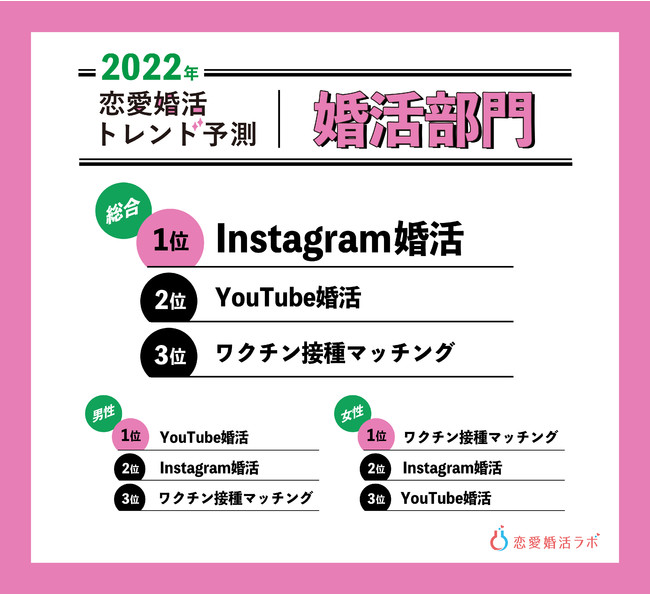 2022年に盛り上がるであろう「婚活」「出会い」の方法についてアンケート調査を行ったところ、「Instagram婚活」「YouTube婚活」など、「SNS婚活」が圧倒的な支持を集めました。