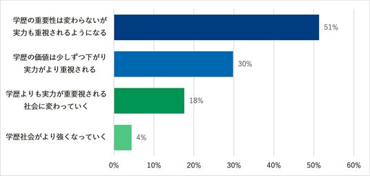 「学歴の重要性は変わらないが、実力も重視されるようになる」と回答した方が 51%となり、次いで「学歴の価値は少しずつ下がり、実力がより重視される」(30%)が続きました。学歴だけではなくスキルや実力が問われる社会への移行を予測する方が全体の 81%になりました。