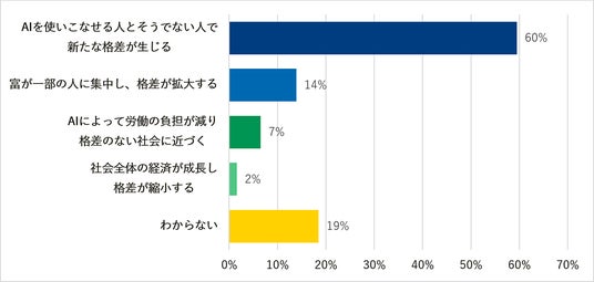 「AIを使いこなせる人とそうでない人で、新たな格差が生じる」と回答する人が最も多く 60%を占める結果になりました。AIリテラシーの差が新たな社会的な格差を生む可能性に対し懸念をいただいている方が多いことが伺えます。一方で、「AIによって労働の負担が減り、格差のない社会に近づく」(7%)とAIに期待する意見も一定数見られました。