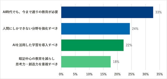 「今まで通りの教育が必要」(33%)という意見が最多となりましたが、「暗記中心の教育を減らし、思考力・創造力を重視すべき」(18%)、「人間にしかできない分野を強化すべき」(24%)、「AIを活用した学習を導入すべき」(22%)など、AIの進化に伴い教育の変革を求める声が全体の 64%に達しました。