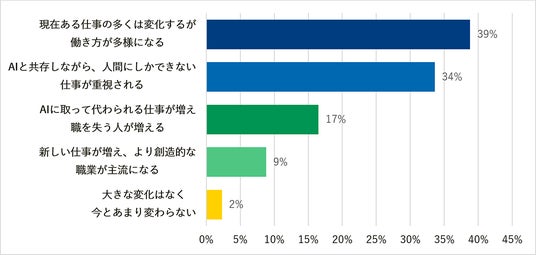「現在ある仕事の多くは変化するが、働き方が多様になる」と回答した方が 39%となりました。また、「AIと共存しながら、人間にしかできない仕事が重視される」という意見も34%以上あり、AIの発展により新しい働き方への期待が高まっています。一方で、「AIに取って代わられる仕事が増え、職を失う人が増える」(17%)と懸念する声もありました。