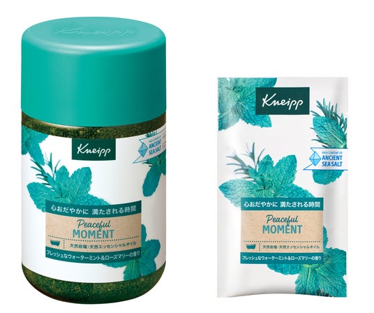 バスタイムをよりリラックスさせるために活用したいのが入浴料。新たに登場した「クナイプ ピースフルモーメント シリーズ」の入浴料は、アクアハーバルの爽やかな香りが特徴です。天然岩塩と植物由来の天然ハーブの香りでお馴染みのバスソルトと、重炭酸(*1)と天然ハーブのエッセンシャルオイルを配合したスパークリングタブレットの2種類をラインアップ。みずみずしく爽やかな香りが特徴のウォーターミント(*2)と澄み渡るような透明感あるローズマリー(*3)の香りで、忙しい毎日に気分をクリアにするような心を満たすバスタイムを提供します。