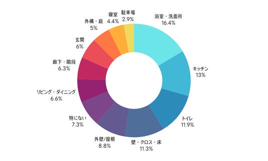 最も多く挙げられたのは「浴室・洗面所」で、次いで「キッチン」、「トイレ」が続きました。このように、毎日使う水回りに関する不満が特に多く寄せられたことがわかります。