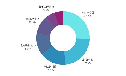 特に「半年に1回程度」と「年に1回程度」の回答が多く、夏休みや冬休みの長期休暇などを利用して帰省する人が多いと推測されます。