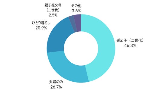現在の家族構成については、「親と子の二世代で暮らしている」と回答した人が最も多くを占めました。また、「夫婦のみ」「ひとり暮らし」といった、親と同居していない世帯も全体の約半数を占める結果に。