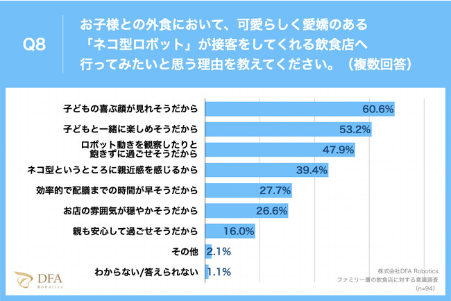 さらに、86.2%の約9割が子供との外食で「ネコ型配膳ロボット」のいる店に行ってみたいと思っていることが明らかになり、理由としては60.6%が「子どもの喜ぶ顔が見れそうだから」、53.2%が「子どもと一緒に楽しめそうだから」という理由が見受けられました。