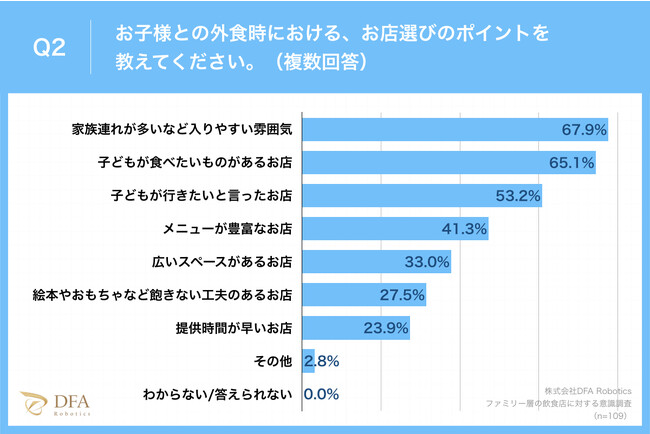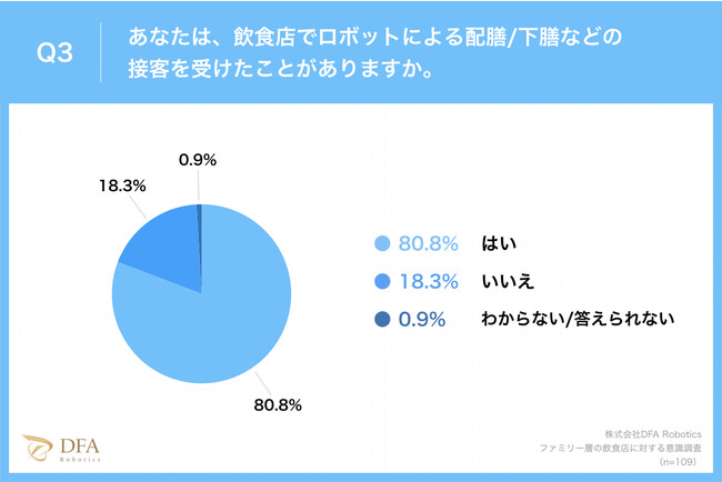 飲食店DXを推進するロボティクスソリューションカンパニーである株式会社DFA Robotics(本社:東京都渋谷区恵比寿 代表取締役:波多野昌昭)は、ファミリー層の飲食店に対する意識調査について1歳以上~小学生以下の子どものいる親109名を対象にアンケート調査を行い、その結果と共に店舗運営の実態および配膳ロボット導入について「ファミリー層の飲食店に対する意識調査レポート」を発表したことをお知らせいたします。