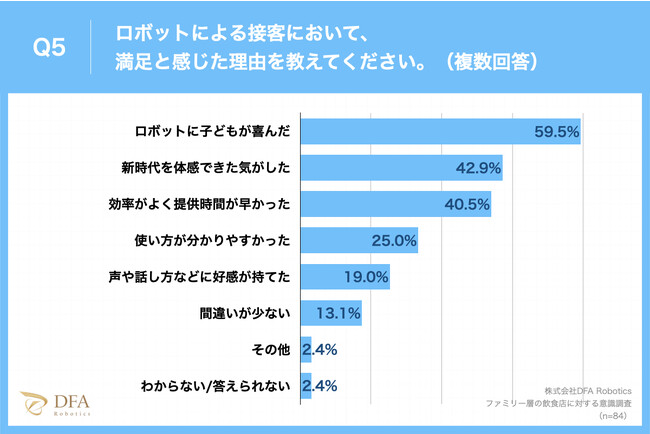 中でも、「ロボットによる接客に満足している」(「とても満足」「やや満足」)と回答した方に、その理由について質問したところ約6割の59.5%が「ロボットに子どもが喜んだ」、42.9%が「新時代を体感できた気がした」、40.5%が「効率がよく提供時間が早かった」と回答しました。
