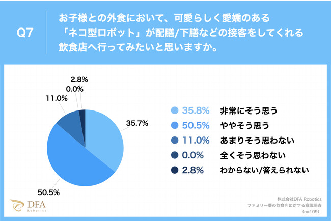 ネコ型配膳ロボットの存在が、子供へのポジティブな影響を及ぼし、ファミリー層が訪れたいと思う一因となっていることが判明し、ファミリー層の飲食店選びにおいて、「ネコ型配膳ロボット」をはじめとするさまざまなサービスロボットが接客してくれる飲食店は、今後さらに世代を問わず支持される存在になると言えます。