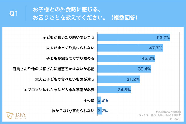 1歳以上~小学生以下の子どものいる親109名を対象に実施したアンケート調査において「お子様との外食時に感じる、お困りごとは何があるか?」という質問に対し、「子どもが動いたり騒いでしまう」が53.2%、「大人がゆっくり食べられない」が47.7%、「子どもが飽きてぐずり始める」が42.2%という回答になりました。