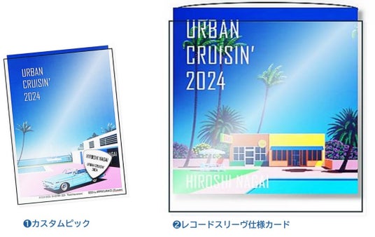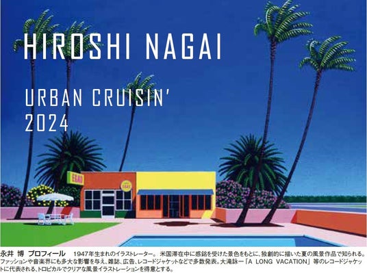 永井博のビジュアルを通して、青い水平線やプールサイド、ヤシの木など