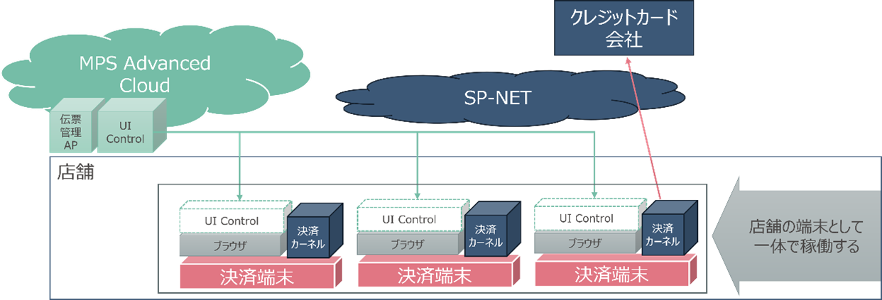 従来の決済端末は、端末ごとに「伝票管理」「ユーザーインターフェース(UI)制御」「決済セキュリティ処理(カーネル)」のすべてを搭載していました。 『MPAC』では、セキュリティ上必須となる「決済カーネル」のみを端末に残し、複雑な処理やアプリケーション、伝票管理機能などはすべてクラウドサーバー側に移行させます。これにより、端末側はブラウザ機能のみを持つ「シンクライアント」構成となり、低価格化を実現するとともに、特定用途に限らない端末の利用が可能になります。その結果、1店舗で複数台数の端末を導入でき、混雑時の決済待ちや故障時の業務停止リスクを軽減できます。