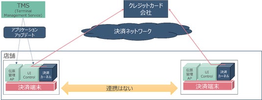 ・ 高額な端末コスト:各端末に決済処理機能一式を搭載するため、1台あたり十数万円のコストが発生し、導入台数が制限される。1店舗1台の場合は、故障すると決済ができない事態が発生する。