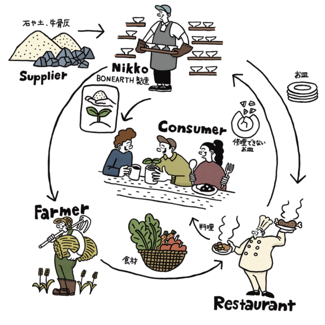 食器が廃棄されることなく循環する世の中を目指し、サーキュラー型のビジネスモデルへの転換をデザイン。この度、ボーンチャイナを肥料にリサイクルする技術を確立し肥料として認定されました。 ニッコーは、レストラン・農作物生産者・生活者など、あらゆる方々と共に食をとりまく循環をつくりあげていくことを目指します。