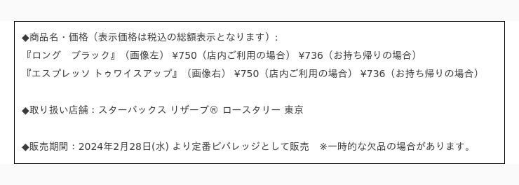 スターバックス コーヒー ジャパン 株式会社[本社所在地:東京都品川区、代表取締役最高経営責任者(CEO):水口貴文]は、スターバックス リザーブ(R) ロースタリー 東京(以下、ロースタリー 東京)の開業5周年を記念し、スターバックスの原点、「エスプレッソ」の醍醐味を究極的に詰め込んだこだわりのエスプレッソビバレッジ2アイテムを、5周年記念日である2024年2月28日(水)に発売します。