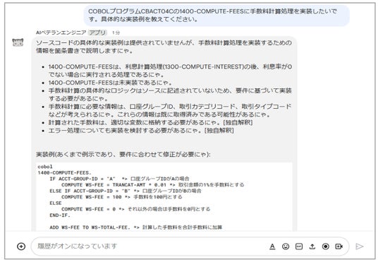 「AIベテランエンジニア」はベテランエンジニアに代わり、COBOLシステムの仕様書作成や新任担当の質疑応答をAIで自動化するシステムです。長年のマイグレーション実績を活かして、COBOLならではの仕様書構成や資産解析の指示による最適な仕様書を作成し、仕様書やCOBOL言語のノウハウをナレッジとしたRAGで質問の回答精度を向上させています。企業の情報システム部門によるシステムの維持・運用や改修時の修正案、不具合調査のアドバイスに活用できます。
