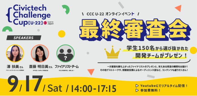 公式サイトフォーム( https://forms.gle/4zheC9tVkHYMQbNs6)・最終審査会イベントページ( https://cccu22-final-2022.peatix.com)にて募集中