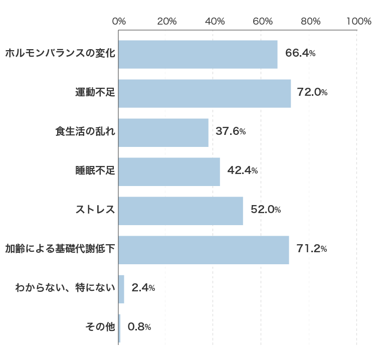 更年期の直接的な影響と思われる「ホルモンバランスの変化」という回答も7割近くになりました。