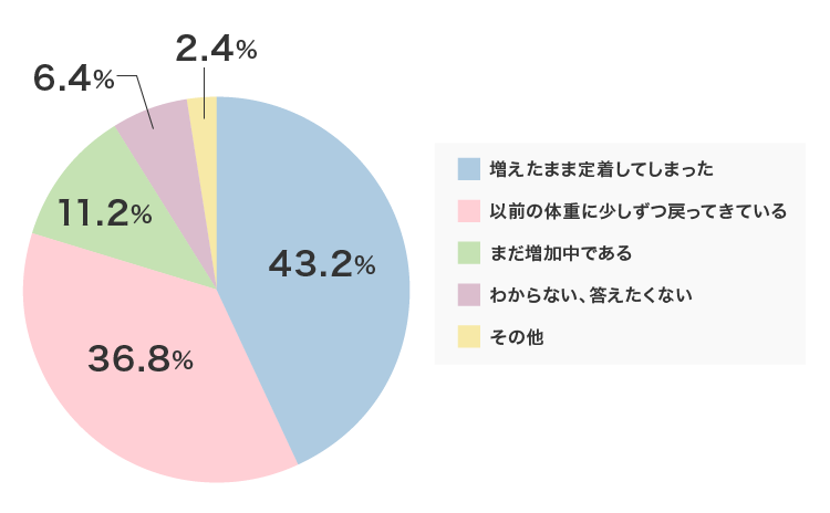 「増えたまま定着してしまった」という回答が「以前の体重に少しずつ戻ってきている」という回答を上回りました。