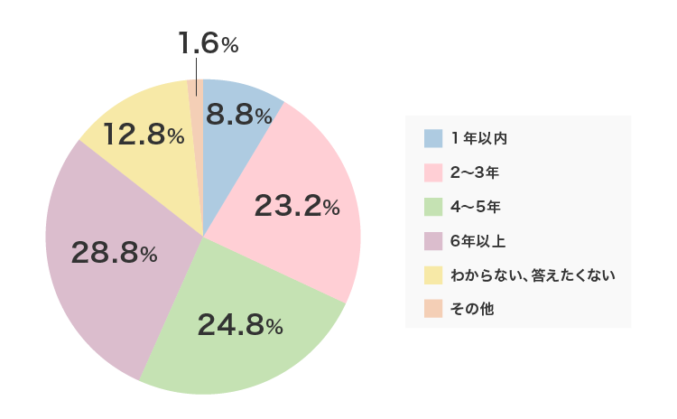 6年以上という回答に、4~5年という回答を加えると5割をこえました。