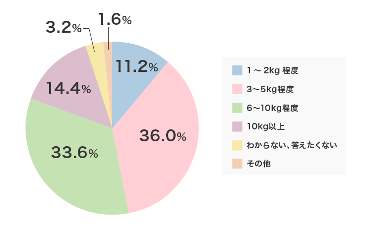 3キロ以上増えた方が85%に達し、そのうち6キロ以上が48%、さらに10キロ以上という回答が14.4%になりました。