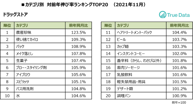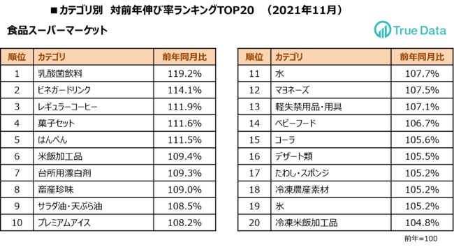 株式会社True Data(トゥルーデータ/本社:東京都港区、代表取締役社長:米倉 裕之) は、当社の統計データをもとに、ドラッグストア、食品スーパーマーケットにおける2021年11月の売り上げ伸長カテゴリを発表します。当月は健康意識の高まりが影響してか、食品スーパーマーケットでは「乳酸菌飲料」、「ビネガードリンク」、ドラッグストアでは「農産珍味」「乳酸飲料」が伸長し、伸び率TOP20の上位にランクインしました。