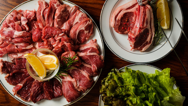 「ラムもも、ラムアーム、ラムランプ、ラムロース、マトンもも」の5種食べ放題に! 羊肉各種を「炭火焼きジンギスカン鍋」でその場で焼き上げ、外側は香ばしく中はジューシーに。ギュッと旨味を閉じ込めるように焼き上がる各羊肉をお楽しみください。