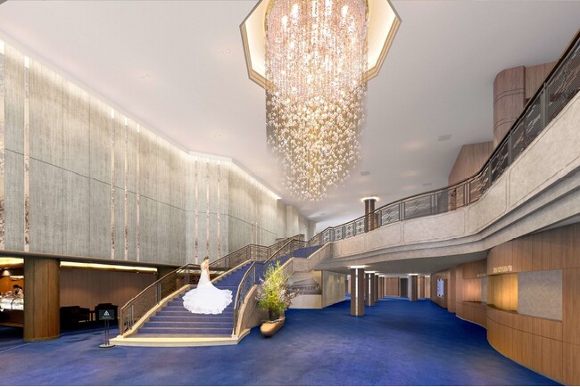 また、バンケット「孔雀」以外にも、メインエントランスロビーやホワイエといったパブリックスペースをリニューアルいたします。今夏、よりクラス感のあるデザインとなる迎賓施設で、おふたりの特別な一日をお過ごしください。