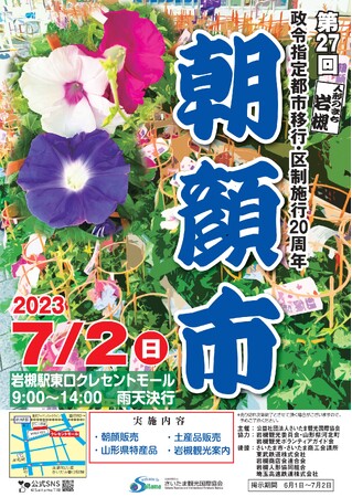 7月2日(日)9:00~14:00、岩槻駅東口クレセントモールにて開催します。この朝顔市は、全国的に有名な「入谷の朝顔市」に岩槻産の朝顔が出荷されていることを市内外に広く紹介することを目的に開催しているもので、27回目を迎えます。今年は、さいたま観光大使「第15代さいたま小町」による朝顔販売のお手伝いや、山形県河北町の特産品の販売、岩槻の名所をめぐる岩槻観光ツアーなど、4年ぶりに賑やかな朝顔市が戻ってきます!なお、ステージイベントは実施しません。