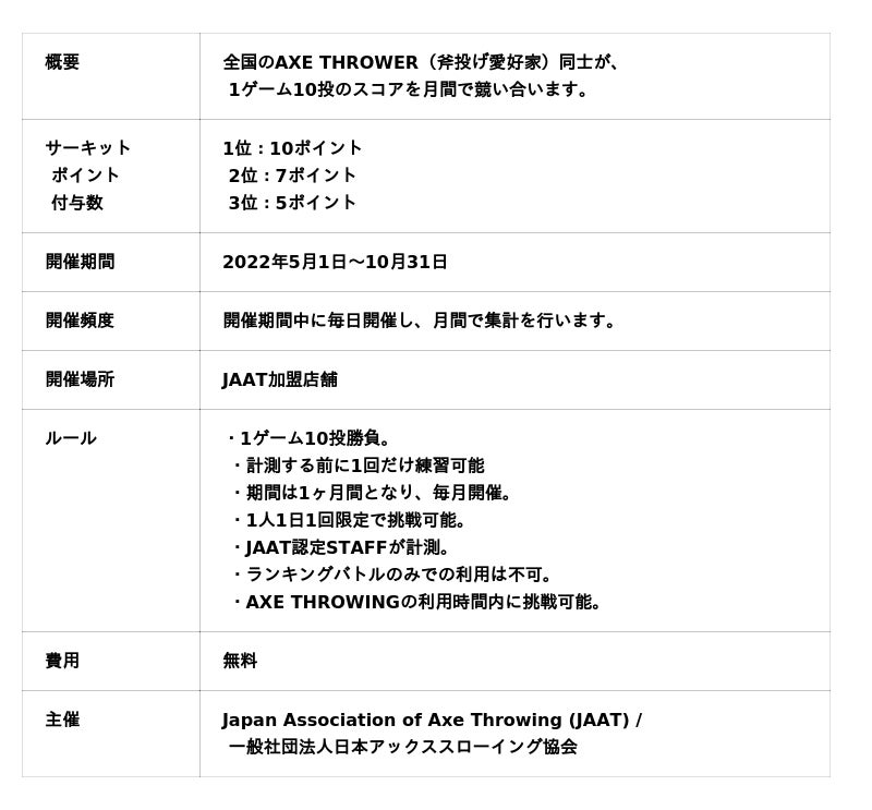 「斧投げ 月間ランキングバトル@JATC2022」とは、全国のAXE THROWER(斧投げ愛好家)同士が、1ゲーム10投のスコアを月間で競い合う、ランキングバトルのことです。開催期間は、2022年5月1日から10月31日となり、開催期間中に一般社団法人日本アックススローイング協会の加盟店舗で毎日開催され、月間で集計を行います。月間ランキングで見事上位3名にランクインした場合、斧投げ日本一決定戦。"Japan Axe Throwing Championship 2022 @TOKYO" への出場権を獲得するために必要なサーキットポイントを貯めることができます。