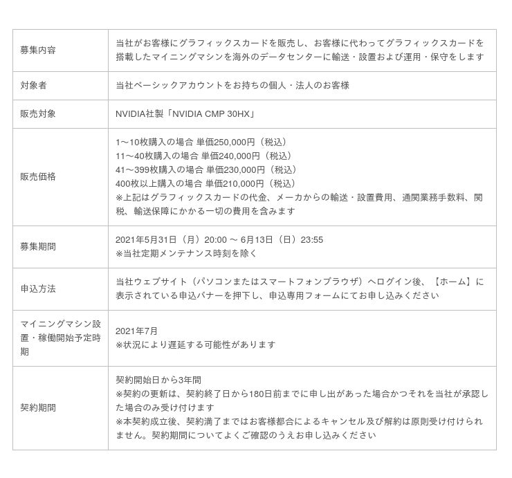 本サービスの提供に伴い、NVIDIA社製グラフィックスカード「NVIDIA CMP 30HX」の販売・運用サービスの募集を開始します。