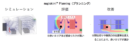 今回、建物の3次元/エアフローデータ等の診断に基づき、空間内感染リスクを科学的に診断する「magickiri™ Planning」を導入し、サーキュレータの設置により、気流を改善させました。