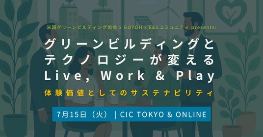 株式会社GOYOH、CIC Tokyo 環境エネルギーイノベーションコミュニティ(E&Eコミュニティ)、米国グリーンビルディング協会(USGBC)は、2025年7月15日(火)にCIC Tokyoにて、ハイブリッドセミナー「グリーンビルディングとテクノロジーが変えるLive, Work & Play:体験価値としてのサステナビリティ」を開催いたします。