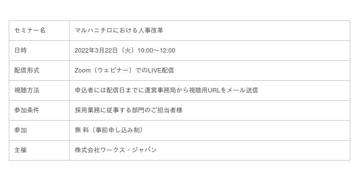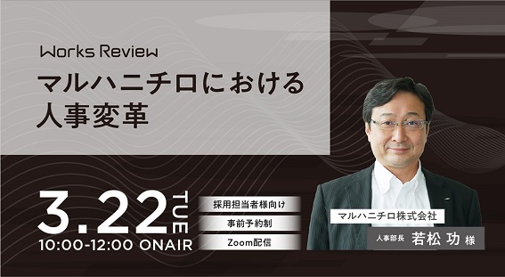株式会社ワークス・ジャパン(本社:東京都千代田区、代表取締役:清水信一郎、以下 ワークス・ジャパン)は、2022年3月22日(火)に採用業務に従事する部門のご担当者様を対象にしたオンラインセミナー「マルハニチロにおける人事変革」を開催します。