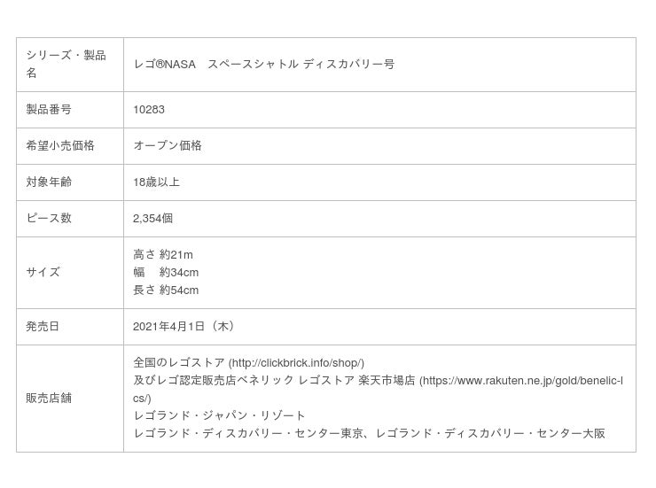 レゴジャパン株式会社(代表取締役社長:長谷川敦/所在地:東京都港区、以下レゴジャパン)は、宇宙探査をテーマに、スペースシャトル「ディスカバリー号」を細部まで再現した大人向けレゴセット「レゴ NASA スペースシャトル ディスカバリー号」を2021年4月1日(木)より発売いたします。