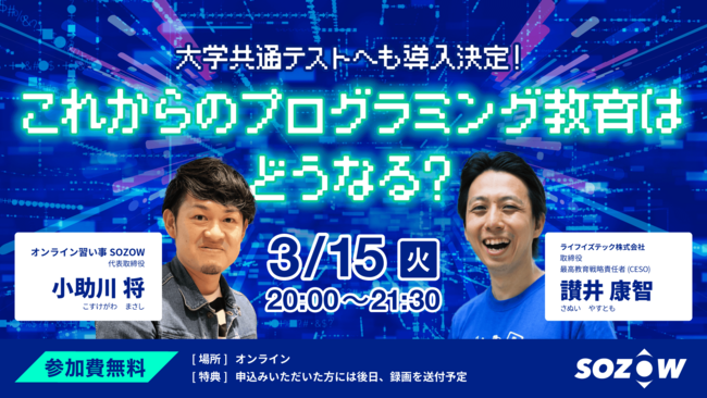 Go Visions株式会社(所在地:東京都品川区、代表取締役:小助川 将)が運営する小・中学生向けオンラインの学び場「SOZOW(ソーゾウ)」は、2022年3月15日(火)にライフイズテック株式会社取締役の讃井康智氏をお招きし、プログラミング教育の未来や可能性をテーマにした保護者向けセミナーを開催いたします。