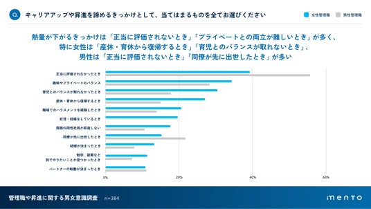 女性は「産休・育休からの復帰」「育児とのバランス」、男性は「正当に評価されない」「同僚が先に出世」でキャリアへの熱量が下がる