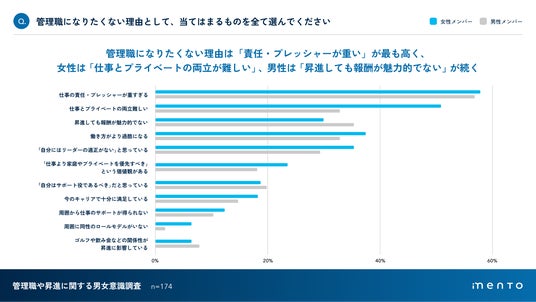 管理職になりたくない理由として当てはまるものを聞いたところ、男女ともに「仕事の責任・プレッシャーが重すぎる」(女性57.8%/男性56.9%)と最も高くなりました。男女の差を見ると、特に女性メンバーは「仕事とプライベートの両立難しい」(女性50.8%/男性32.8%)、男性メンバーは「昇進しても報酬が魅力的でない」(女性29.9%/男性35.3%)が高い結果となりました。