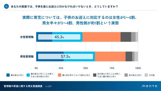 実際に育児について「あなたの家族では、子供を急にお迎えに行かなければいけないとき、どうしていますか?」と聞いたところ、女性管理職は「妻が迎えに行く」(15.7%)、「妻が迎えに行くことが多く、たまに夫が迎えに行く」(29.6%)、男性管理職は「妻が迎えに行く」(26.9%)、「妻が迎えに行くことが多く、たまに夫が迎えに行く」(30.6%)と男女ともに約5~6割は女性が対応、男女半々が3~4割、男性側が1割という実態であるとわかりました。