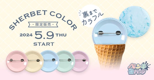 2024年5月9日、オリジナル缶バッジ製作のWebショップ「缶バッジの達人」より、数量限定で「シャーベットカラー ペンキ缶バッジ」を販売スタート。チラりとのぞく、淡いシャーベットカラーは、ストロベリー、バニラ、ソーダ、ミント、グレープの全5色を用意しました。表面のオリジナルデザインと裏面のシャーベットカラーの組み合わせにより、特別なオリジナル缶バッジを製作できます。