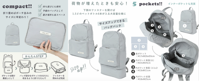 外側のポケットのファスナーを開いてたためば、あっという間にポーチサイズに変身。下側のファスナーを開けば1.5リットルのペットボトル6本が入る大容量仕様にも!出先で荷物が増えそうな時にも「qbag」にポンと入れておけます。インナーポケットも大充実!