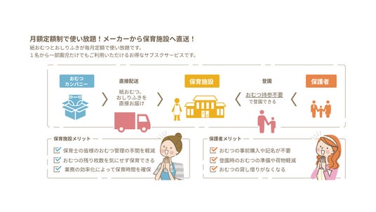 「おむつカンパニー」は、保育施設において必要とされる紙おむつを、必要な時に必要な量だけ提供するサービスです。これにより、保育施設の保育士は園児ごとの紙おむつの個別管理から解放され、より子どもたちと向き合う時間を増やすことが可能になります。また、保護者にとっても、毎日の紙おむつの準備や持ち運びの手間が省け、忙しい日々の中で少しでも負担を軽減することができます。